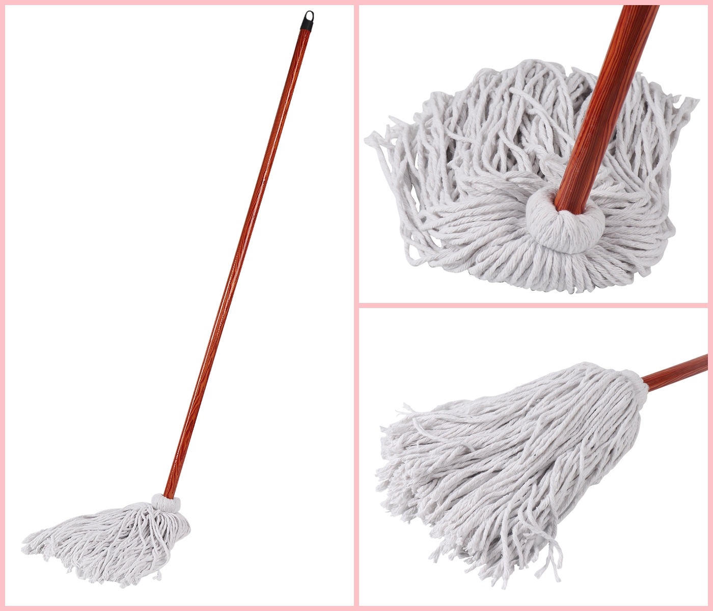 Atualize sua limpeza com a limpeza molhada de algodão com alça de madeira. Apresentando uma alça de madeira natural e uma cabeça de fios de algodão premium, este esfregão durável é perfeito para todos os tipos de piso - hardwood, telha e laminado. Reforçado com pregos de ferro para obter força extra, é ideal para casas, escritórios e uso ao ar livre. Leve, ecológico e construído para durar, é a ferramenta de limpeza final para um desempenho sem esforço