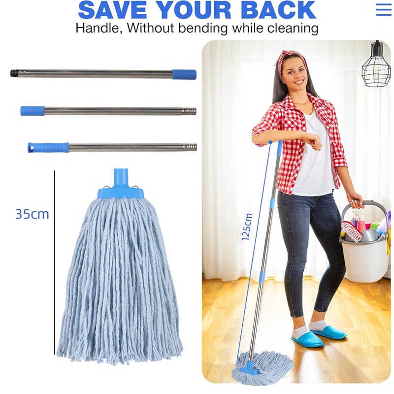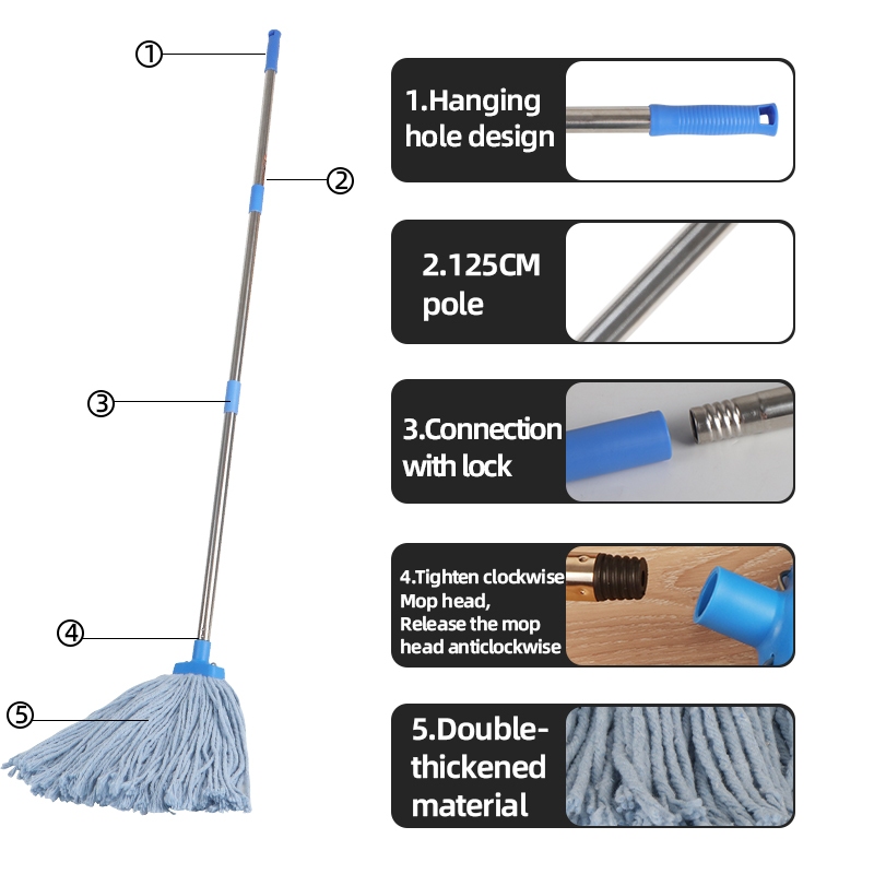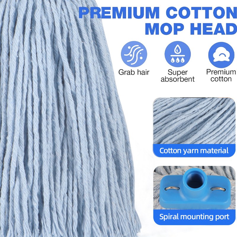 🔹Material da cabeça do esfregão: A cabeça do esfregão é feita de algodão. Eles têm maior absorção de água e podem absorver mais de 7 vezes o seu próprio peso de água. O barbante macio não risca a superfície do piso e pode limpar e remover respingos de forma rápida e eficaz, tanto molhados quanto secos.